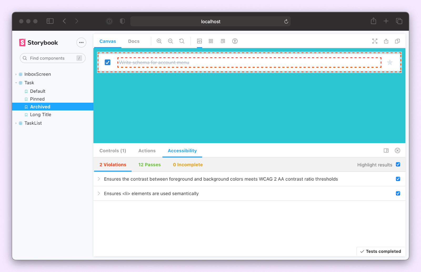 스토리북의 접근성은 활성 스토리에 Axe를 실행합니다. 테스트 결과를 패널에 시각화하고 규칙을 위반한 모든 DOM 노드를 추려서 나타냅니다.